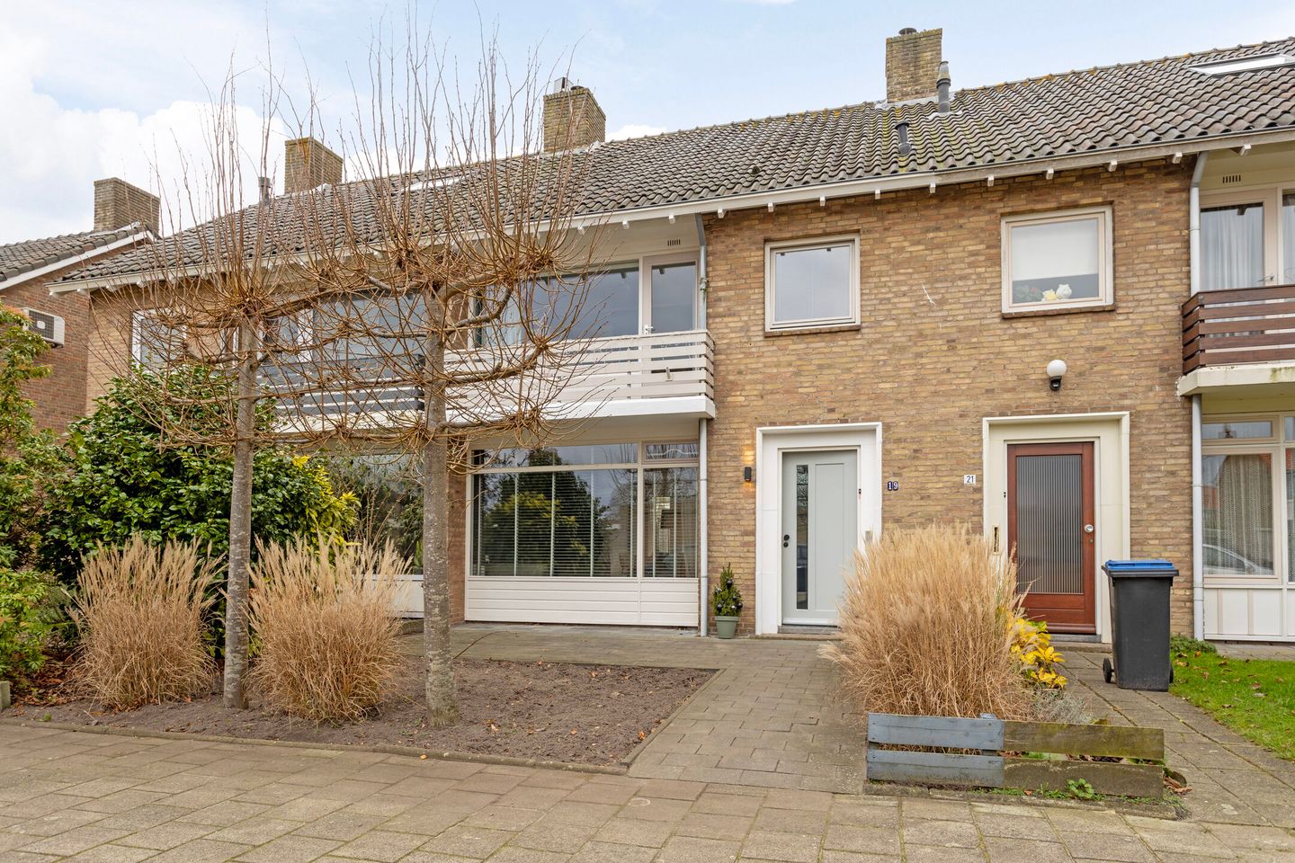 Voortuin, v.v. sierbestrating, plantenborders met diverse beplanting.