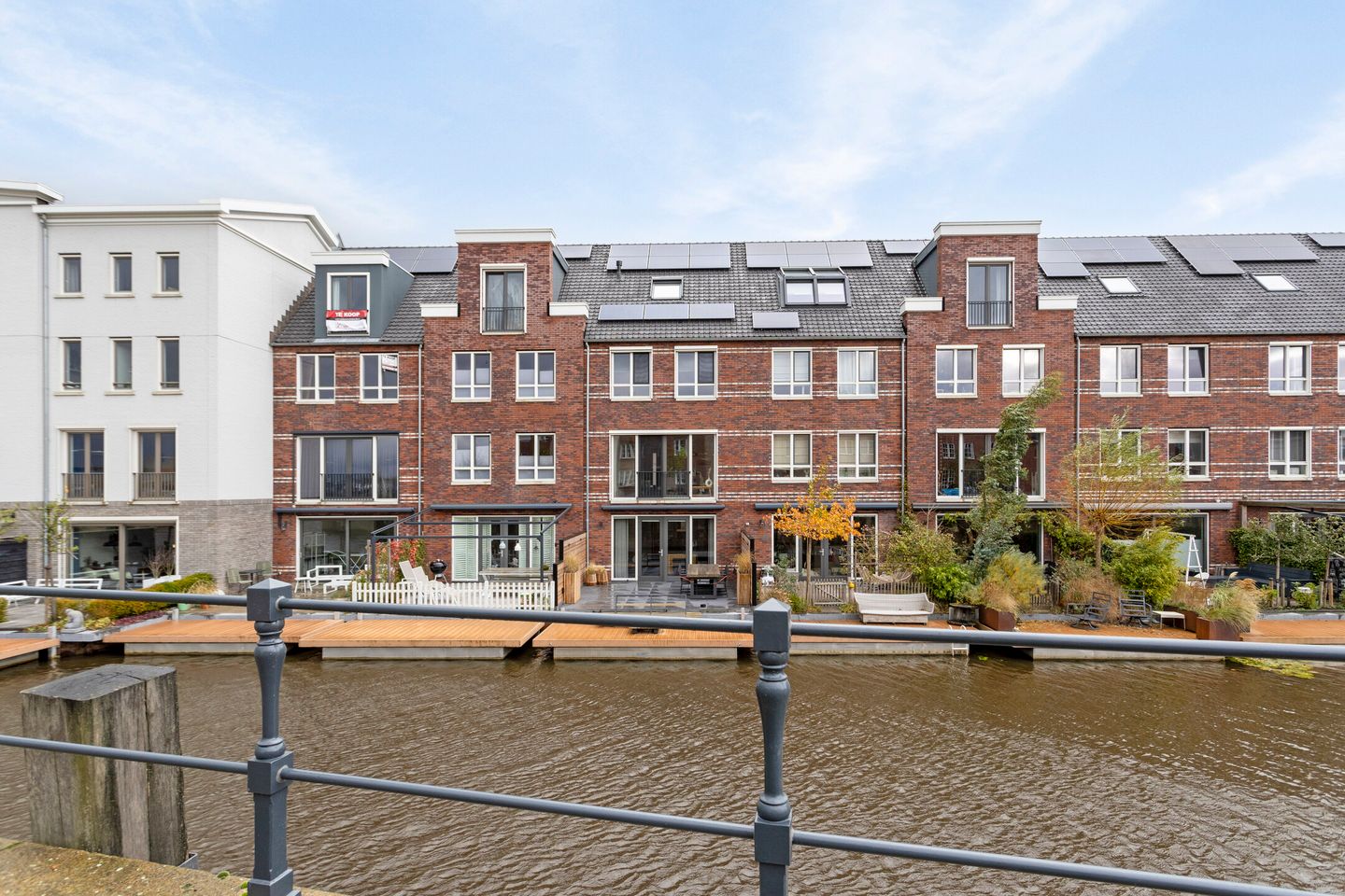 Aangelegde zonnige stadstuin, welke geheel opnieuw is aangelegd in 2024, bestraat met keramische tegels en voorzien van een houten vlonderterras op het water.