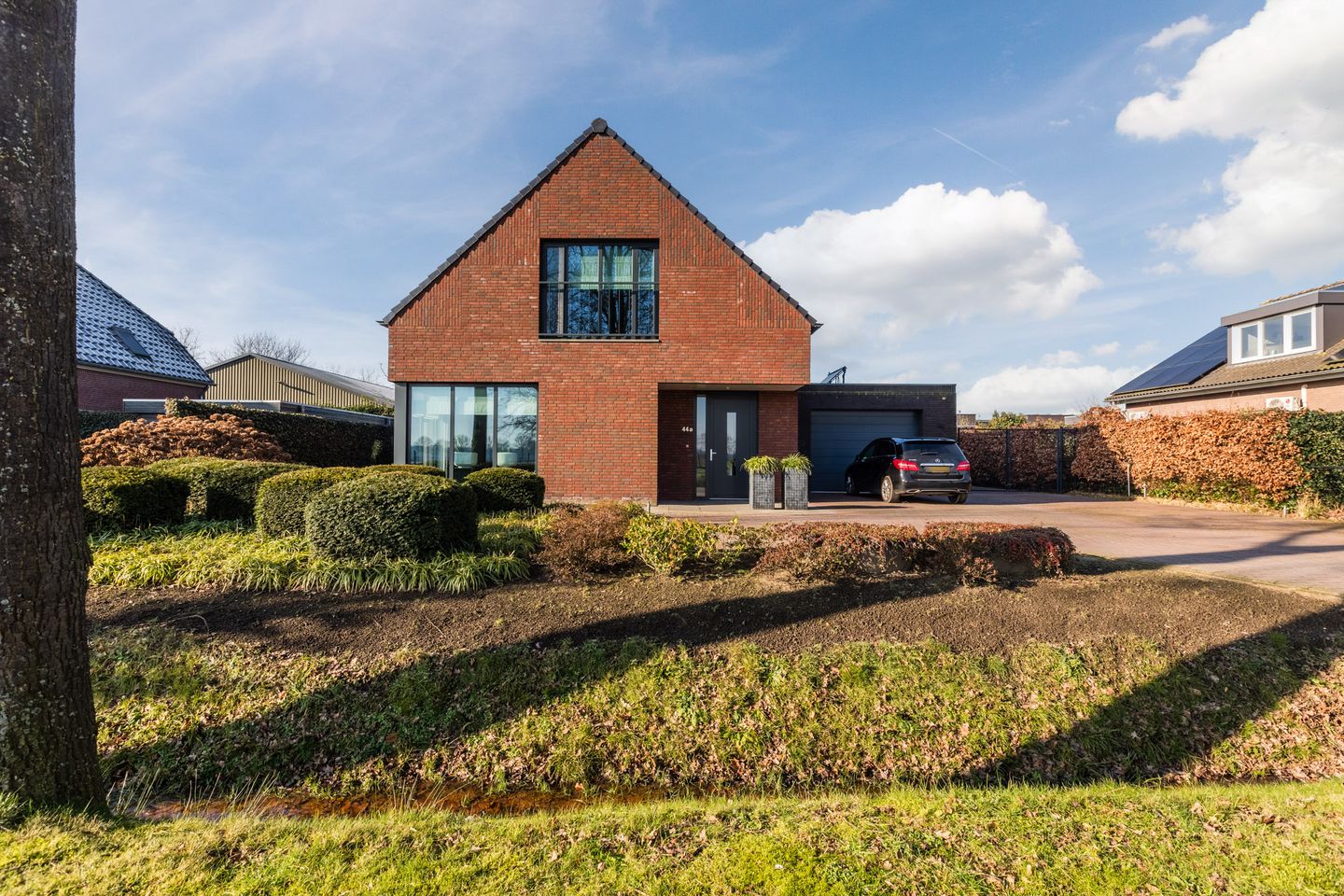 Via de ruime voortuin met royale oprit komen we aan bij de voordeur van het huis. Er is zowel een voordeur aan de voorzijde als aan de zijkant van het huis.