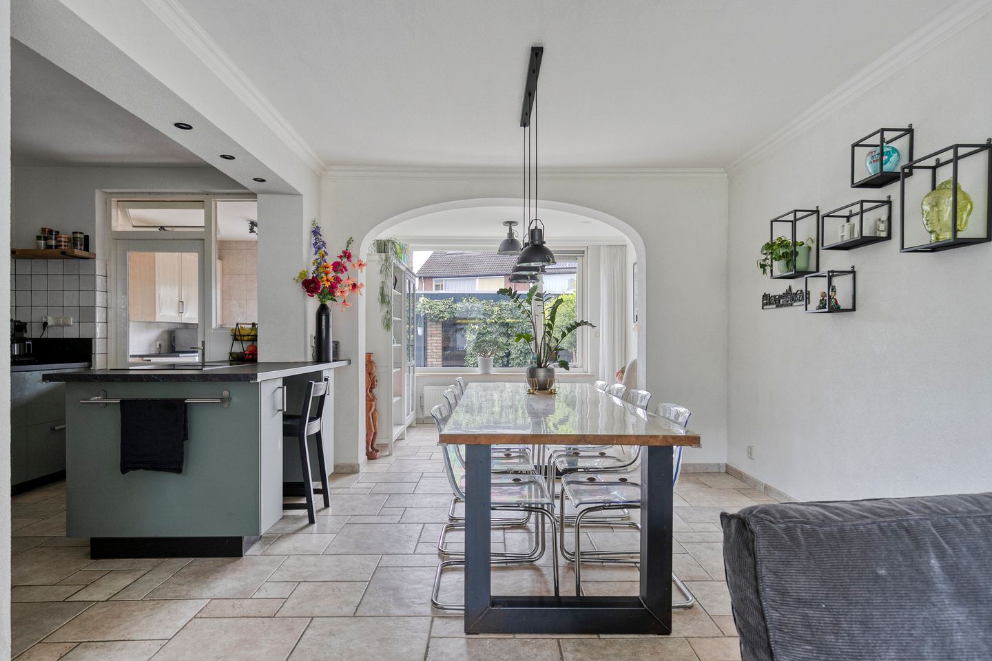 Via de hal met vernieuwde meterkast en moderne toiletruimte met wandcloset, betreed je de lichte woonkamer. De begane grond is afgewerkt met een tegelvloer en comfortabele vloerverwarming. De open keuken aan de voorzijde is uitgerust met diverse inbouwapparatuur zoals een inductiekookplaat, koelkast, vriezer, oven en vaatwasser. De uitgebouwde bijkeuken is praktisch ingericht met extra werkblad en aansluitingen voor o.a. een tweede vaatwasser en droger. Vanuit hier bereik je de net aangelegde achtertuin met kunstgras, plantenborders, een nieuwe achterdeur, ruime stenen berging met stroom en een overkapping.