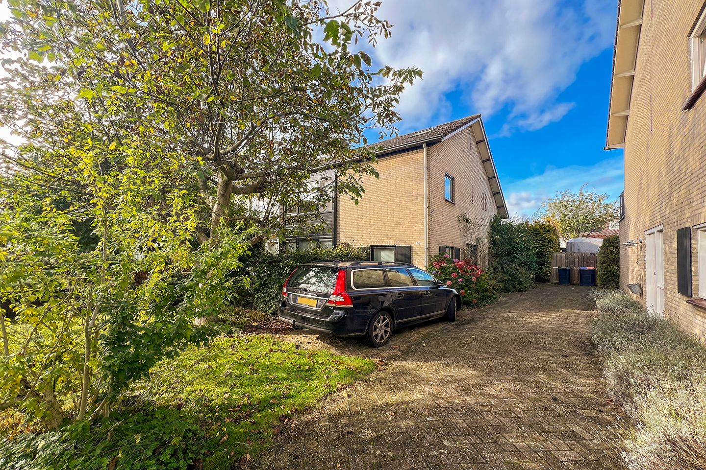 Via de ruime, gedeelde oprit en de fraai aangelegde diepe voortuin bereikt u de voordeur van deze woning. Daarnaast heeft u hier toegang tot de achtertuin via een poort en een afgesloten doorgang naar de garage.