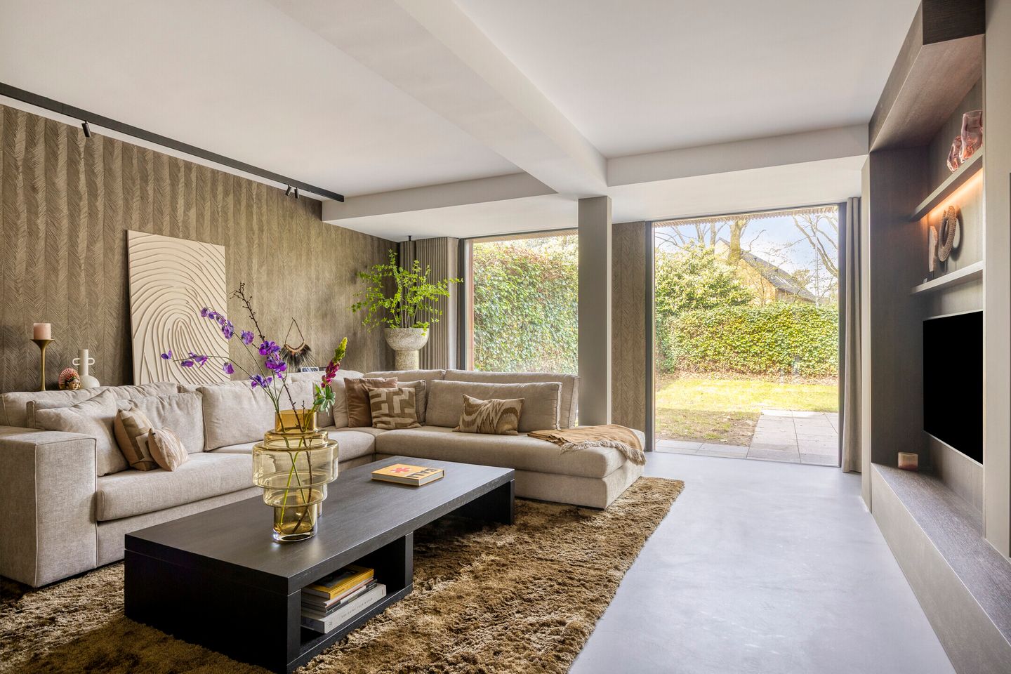 De woonkamer is een ware blikvanger, met grote raampartijen tot aan de vloer die een naadloze verbinding creëren met de achtertuin. Openslaande tuindeuren versterken dit gevoel van binnen-buiten leven. Centraal in de ruimte bevindt zich de stijlvolle gashaard, die zowel vanuit het zitgedeelte als het eetgedeelte zichtbaar is – een sfeervol middelpunt dat warmte en gezelligheid brengt.