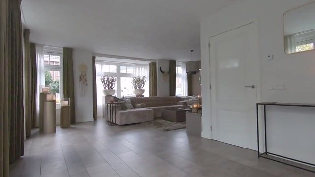 Je komt deze luxe woning binnen via de hal met fraaie hardhouten trap. Vanuit hier betreed je de L-vormige woonkamer, een bijzonder lichte leefruimte dankzij de grote raampartijen en de erker aan de voorzijde, de gashaard en de tegelvloer geven de woonkamer een sfeervolle en warme uitstraling. De tegelvloer loopt door over de gehele begane grond en is voorzien van vloerverwarming. Tevens is de begane grond voorzien van een airco.