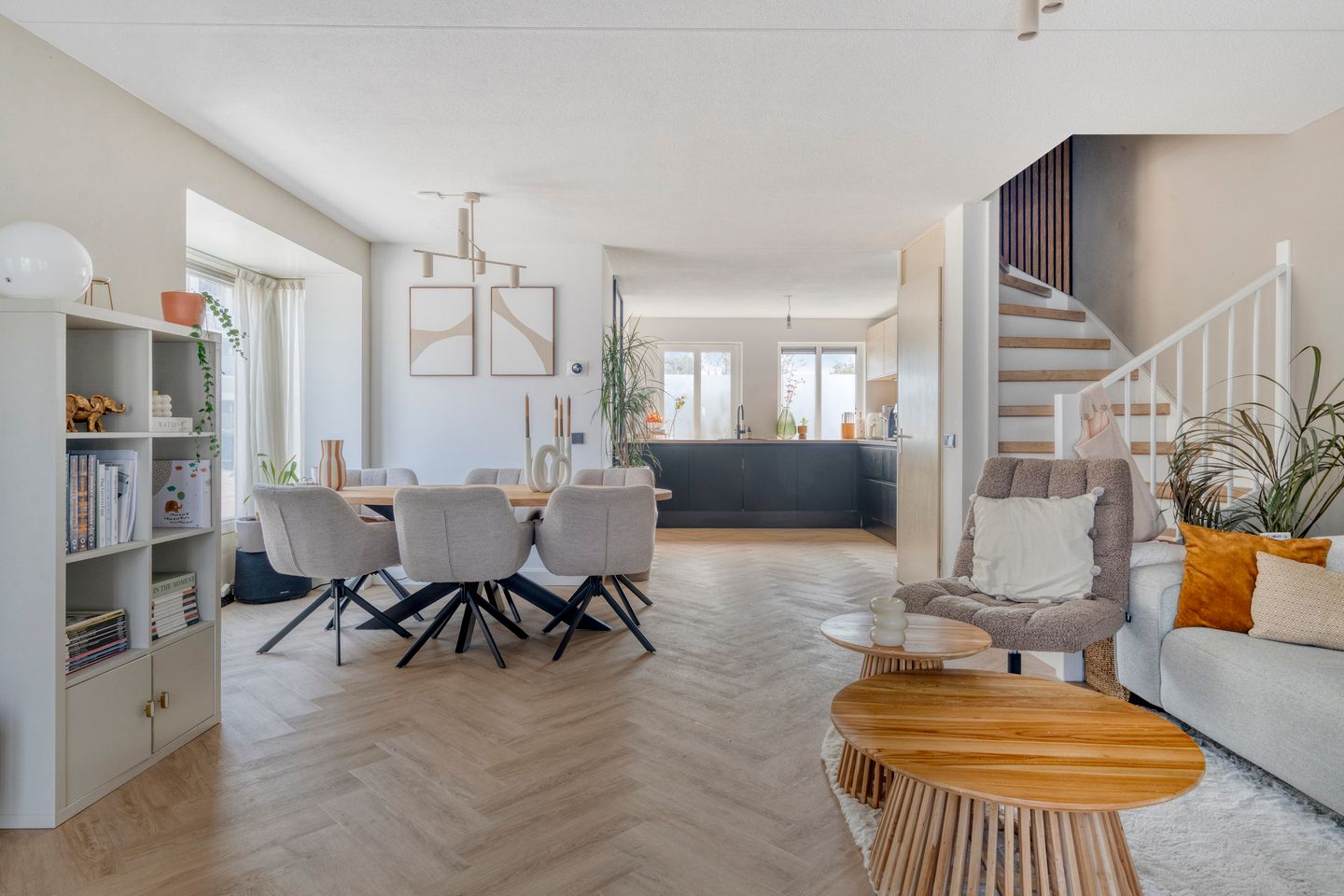 De woonkamer is heerlijk licht en beschikt over een speelse erker, een praktische trapkast en openslaande deur naar de tuin. Aan de voorzijde ligt de open keuken in een L-vormige hoekopstelling. De keuken is compleet uitgerust met hoogwaardige inbouwapparatuur, waaronder een Bora inductiekookplaat met geïntegreerde afzuiging, Quooker, vaatwasser, combi-oven en koel-vriescombinatie.