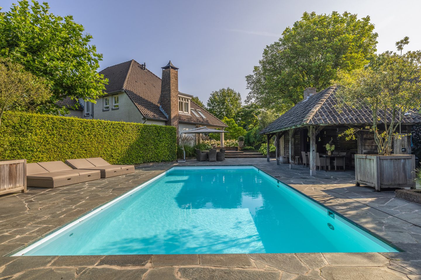 De volwassen en magnifiek aangelegde tuin is een eyecatcher, met meerdere terrassen, een verwarmd zwembad en poolhouse met buitenkeuken, voor heel veel buitenplezier en ontspanning met het hele gezin.