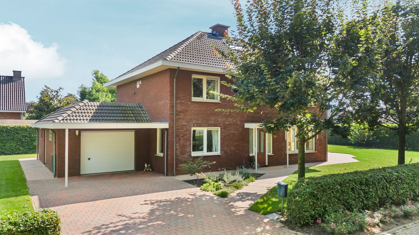 De ruime hal biedt toegang tot een apart toilet met fonteintje. Aan de linker-voorzijde van de woning bevindt zich een multifunctionele kamer, ideaal als slaap-/werkkamer, met extra bergruimte onder de trap. Vanuit de hal en via openslaande deuren kom je in de royale leefruimte, die aan de zijkant is uitgebouwd met een erker en een schuifpui naar het terras en de tuin. De leefruimte heeft een zithoek en een aparte eetruimte, met een gashaard voor extra warmte op kille avonden en dagen. De eetkeuken, bereikbaar via een schuifdeur, heeft een L-opstelling en is uitgerust met een keramische kookplaat, oven, vaatwasmachine, afzuigschouw en koelkast. De ruime eetkamer heeft eveneens een schuifpui naar de overkapping met bovenlicht, die toegang biedt tot de tuin. Vanuit de keuken kom je in de bijkeuken, voorzien van inbouwkasten, een aanrechtblok met gootsteen en ruimte voor wasmachine en andere apparatuur. In deze ruimte zijn mogelijkheden aanwezig om een extra badkamer op de begane grond te realiseren. De bijkeuken leidt naar de royale garage, die volledig geïsoleerd is en een elektrische sectionaaldeur heeft. Hier bevinden zich de cv-ketel en de verdeler van de vloerverwarming. De garage biedt extra bergruimte door een kleine tussenzolder (vide), een bergkast en toegang tot de tuin. Aan de voorzijde van de garage is een korte carport aanwezig.