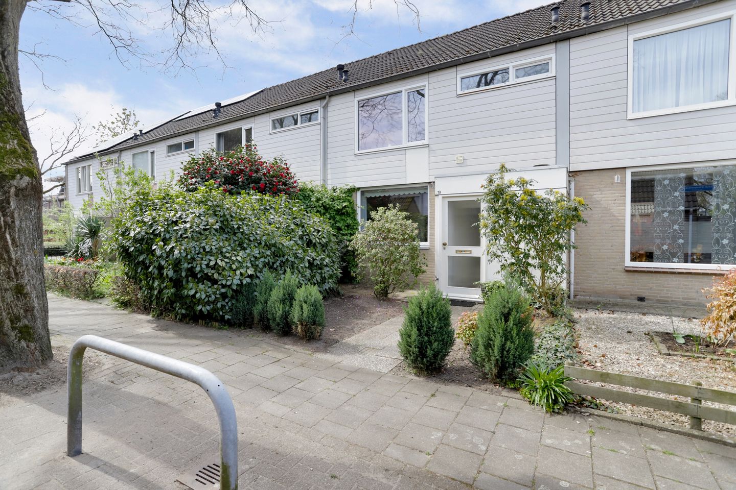 De voortuin is goed onderhouden en bestaat deels uit beplanting en bestrating. Aan de rechterzijde van de woning zijn er voldoende gemeenschappelijke parkeerplaatsen.