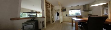 entree met ruime hal en garderobe, toilet, deur naar inpandige aangebouwde grote garage, vanuit de hal kom je in de grote living waar veel natuurlijk licht invalt door de grote ramen/glazen achterpui die je meteen toegang geeft tot de heerlijke en diepe tuin, eet/zithoek bij de open keuken en die is voorzien van inbouwapparatuur
