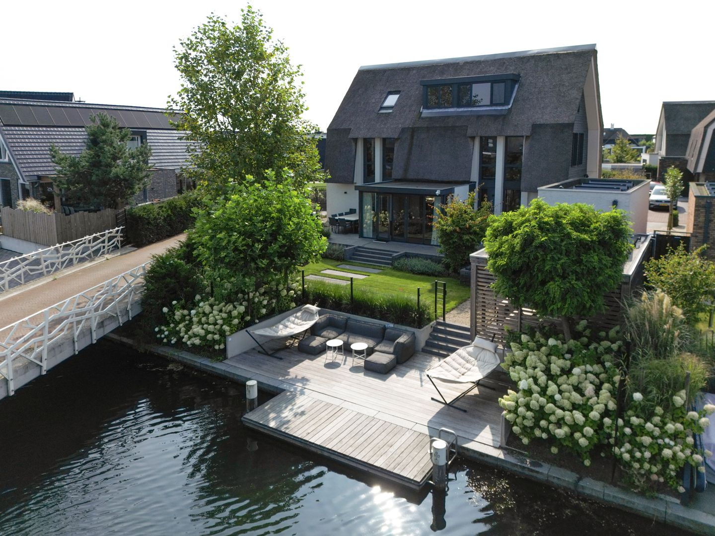 Fraaie aangelegde tuin met sprinkler installatie, verlichting en zorgvuldig gekozen beplanting die zorgen voor privacy en elk jaargetijde een mooi uitzicht. Er zijn rond het huis meerdere terrassen, waarvan een direct aan het water met ligplaats voor een boot. En als klap op de vuurpijl nog een overdekt terras met een jacuzzi.