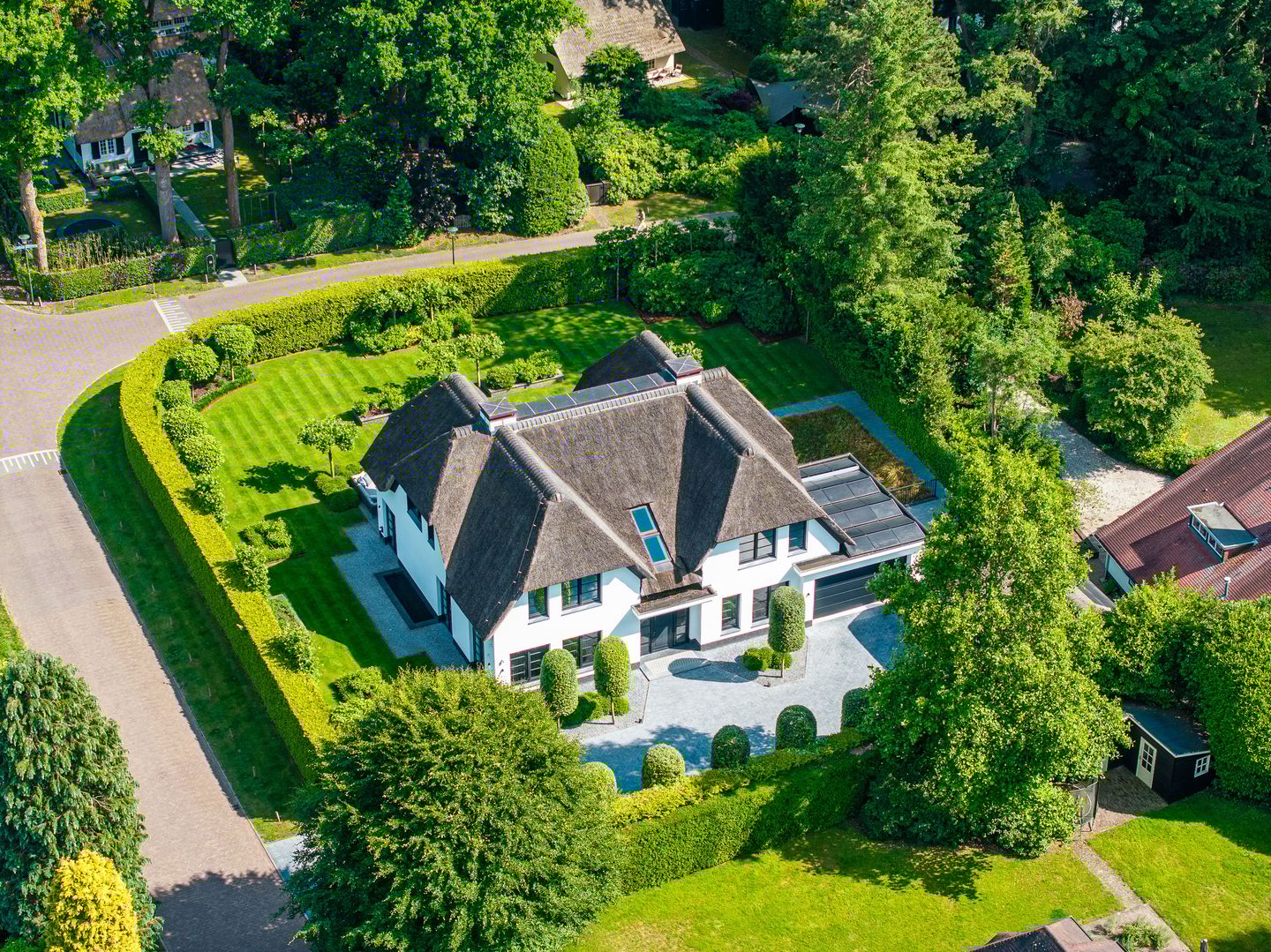 Aan een van de mooiste lanen van Blaricum, in het midden van de Gouden Driehoek, verscholen achter hoge hagen en een automatische poort, ligt deze rietgedekte villa (2017). Een oase van rust en verfijning, met een zeldzame combinatie van woonoppervlak (ca. 545 m²), wellness-souterrain, inpandige garage én een vrijstaande garage/berging — alles omgeven door een fraai aangelegde tuin op het zuiden.