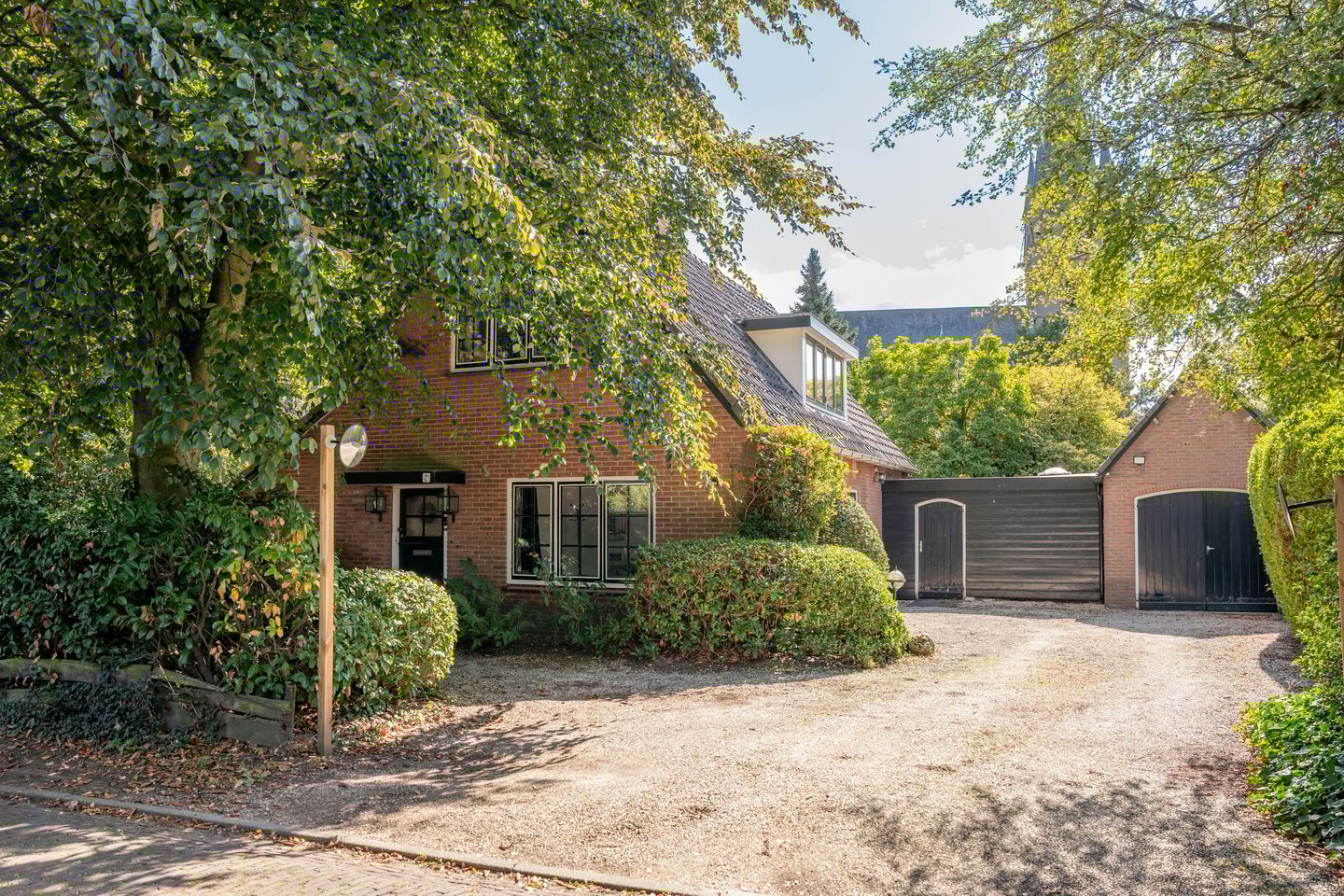 De tuin rondom is royaal en biedt maximale privacy. Aan de voorzijde is er ruime parkeergelegenheid op eigen terrein. De garage is toegankelijk via openslaande deuren verbonden middels een aparte toegangsdeur naar de berging/bijkeuken. Achter en aan de zijkant van de woning geniet je van zon, schaduw en rust op elk moment van de dag.