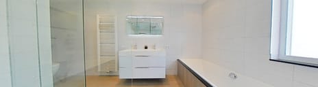 - Dubbele wastafel, inloopdouche, ligbad, toilet, wastafelmeubel, douche, en wastafel