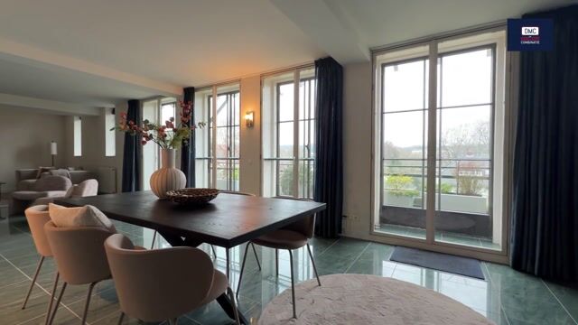 Stylish and luxurious duplex apartment of no less than 255m² located on the second floor with high windows and doors, bronze window frames, a beautiful balcony at the front above the main entrance, and a wonderfully large roof terrace at the rear, located near the village center of Bloemendaal in the historic "Bloomingdale" apartment complex.