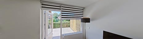 Vanuit de entree toegang tot de hal met doorlopende laminaatvloer, moderne toiletruimte met wandcloset en fonteintje. Woonkamer met open keuken (6.07 x 5.19 m) met luxe keuken installatie in parallel opstelling met composiet werkblad en voldoende kastruimte, inbouwapparatuur te weten: Bora inductie kookplaat met kookveld afzuiging, combi-magnetron, koelkast en vaatwasser. Vanuit de woonkamer toegang tot de omsloten recente betegelde achtertuin/patio met nieuwe tuin afscheiding met poort naar eigen vaste parkeerplaats.