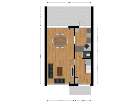- 64 m² (10,03 meter diep en 6,36 meter breed)