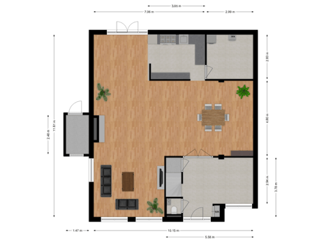 - 62 m² (11,25 meter diep en 5,50 meter breed)