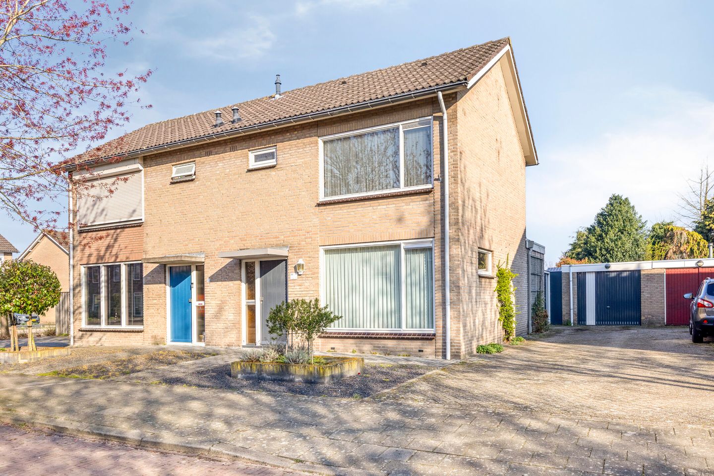 Een groot pluspunt van deze woning is de ruime, vrijstaande garage met daglicht dankzij een groot raam, voorzien van elektra en een handmatige overheaddeur. Achter de garage bevindt zich een extra berging van vergelijkbare grootte. De lange oprit langs de woning biedt ruimte voor het parkeren van maar liefst drie auto’s op eigen terrein.