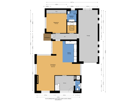 Op de begane grond bevindt zich tevens een ruime slaapkamer van circa 17,0 m² met vaste kastenwand. De aangrenzende badkamer (ca. 4,6 m²) is ingericht met een douche, wastafel en toilet. Daarnaast is er een separate ruimte van circa 4,4 m², geschikt als wasruimte of berging. Vanuit de hal is de aangebouwde garage binnendoor bereikbaar.