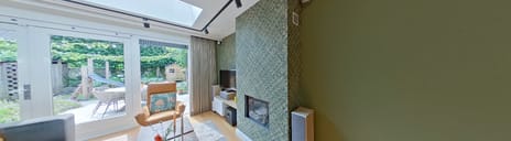De tuingerichte woonkamer is opvallend licht en royaal van opzet, met brede openslaande deuren naar de achtertuin en een prachtige lichtstraat in het uitgebouwde gedeelte.