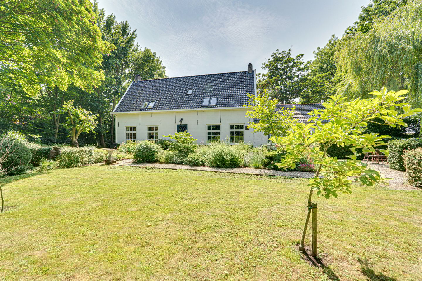 Met het zonnetje op onze pet lopen we naar buiten en dan is het gewoonweg: wauw. Het is bijna onmogelijk om in de zomer door al het groen de rest van de buitenwereld nog te zien. Hier geniet je van een prachtig aangelegde siertuin, een gazon, een moestuin, een kippenverblijf, een tuinkas en — niet te vergeten — de mancave: de garage met aparte werkplaats en drie stallen. De voortuin maakt het plaatje compleet.