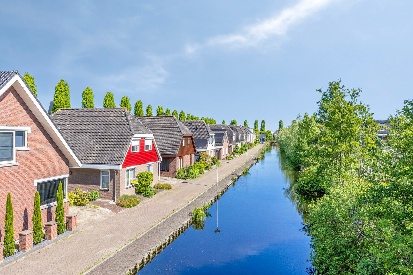 Ruime entreehal met toegang tot de diverse vertrekken. De ruime woonkamer is een waar genot, met een sfeervolle uitstraling en veel natuurlijk licht. De schuifpui aan de achterzijde van de woning zorgt voor een naadloze verbinding met de heerlijke achtertuin. Hier kun je genieten van de buitenlucht, terwijl je ontspant op de houten vlonder aan het water. Dit is een perfecte plek om te genieten van zomerse avonden of om gewoonweg te relaxen met een mooi uitzicht.