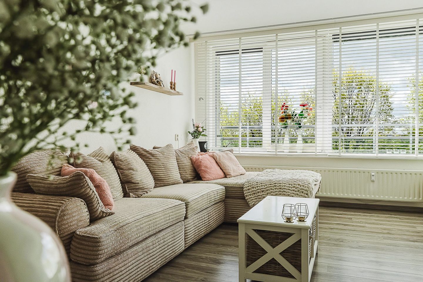 De woonkamer is ruim van opzet (circa 25 m²) en door de grote raampartijen licht en overzichtelijk. De ligging op de vijfde verdieping zorgt voor een vrij en open uitzicht.