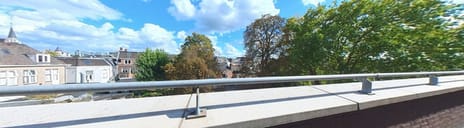 De verrassend ruime woonkamer (ca. 4.79 x 4.85m) is afgewerkt met een mooie Azobe hardhouten vloer, voorzien van een trapkast en biedt middels dubbele openslaande deuren toegang tot het balkon (loggia). Het balkon (ca. 5.06 x 4.85m) is ondanks de centrumlocatie heerlijk stil, biedt een mooi uitzicht over de binnentuin en door de ligging op het westen kan hier heerlijk van de middag- en avondzon worden genoten.
