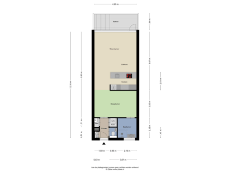 De lichte studio is afgewerkt met een laminaatvloer en stucwerk als wand- en plafondafwerking. De royale raampartijen zorgen voor veel daglichttoetreding. Vanuit de woonkamer is het balkon (gelegen op zuidwesten, ca. 1,90 m x 4,85 m) bereikbaar.