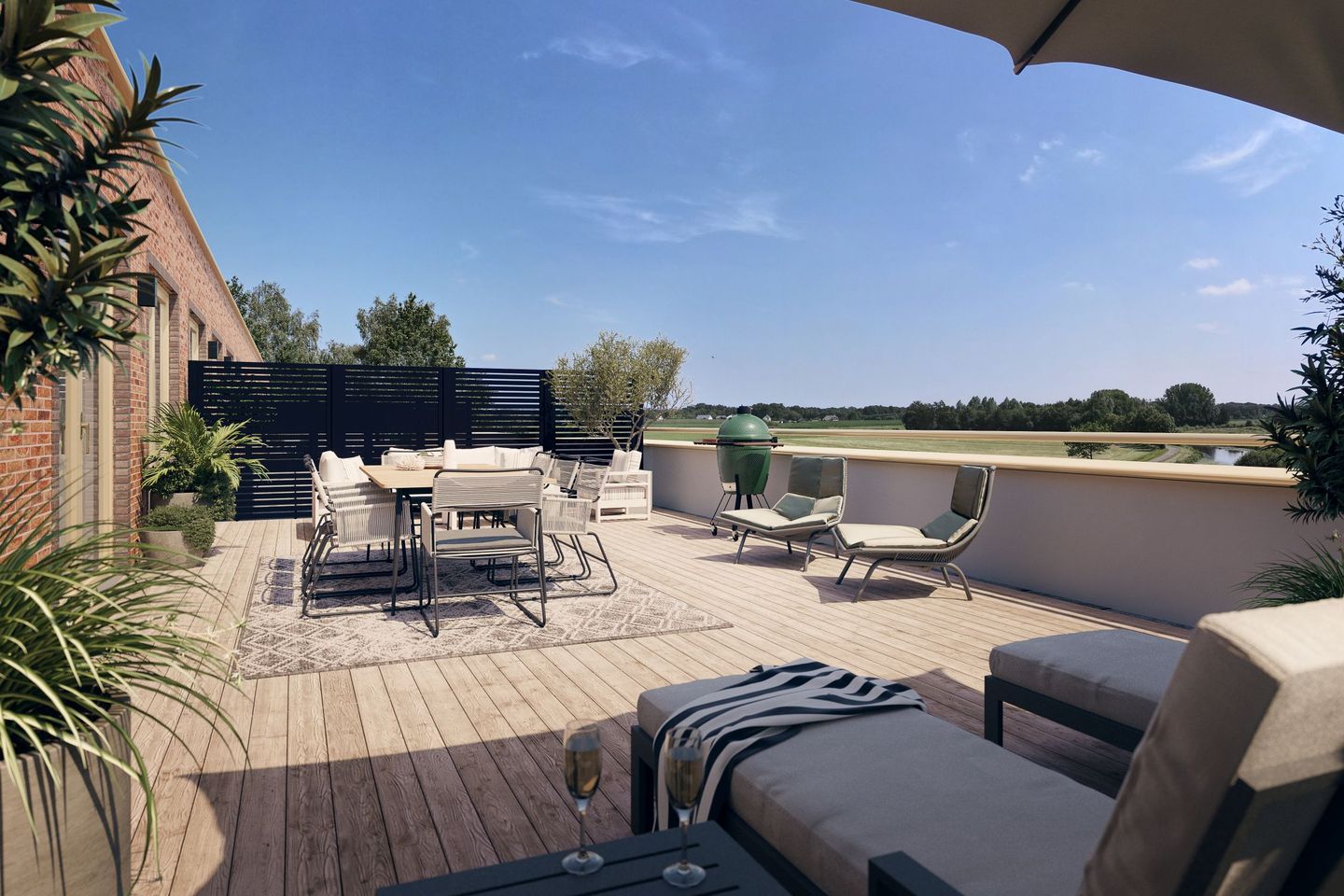 Bovendien beschikt Type Kolonel over een meer dan riant dakterras, dat via de openslaande deuren vanuit de living bereikbaar is. De uitgebreide buitenruimte biedt een perfecte plek om te ontspannen en te genieten van het panoramische uitzicht en de rustige omgeving.