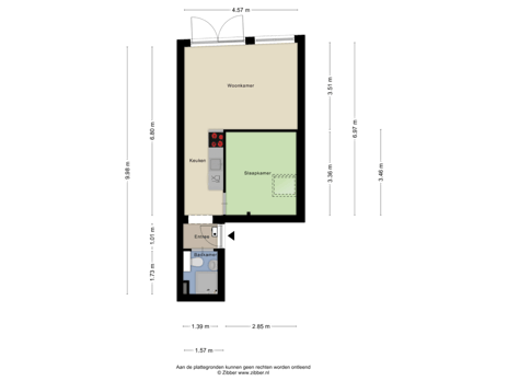 - 7 m² (4,40 meter diep en 1,62 meter breed)
