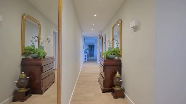 Entree in hal/gang met garderobekast, werkkast en toegang tot woonkamer, keuken, slaapkamers en badkamer. De gang is voorzien van inbouwverlichting in het plafond.
