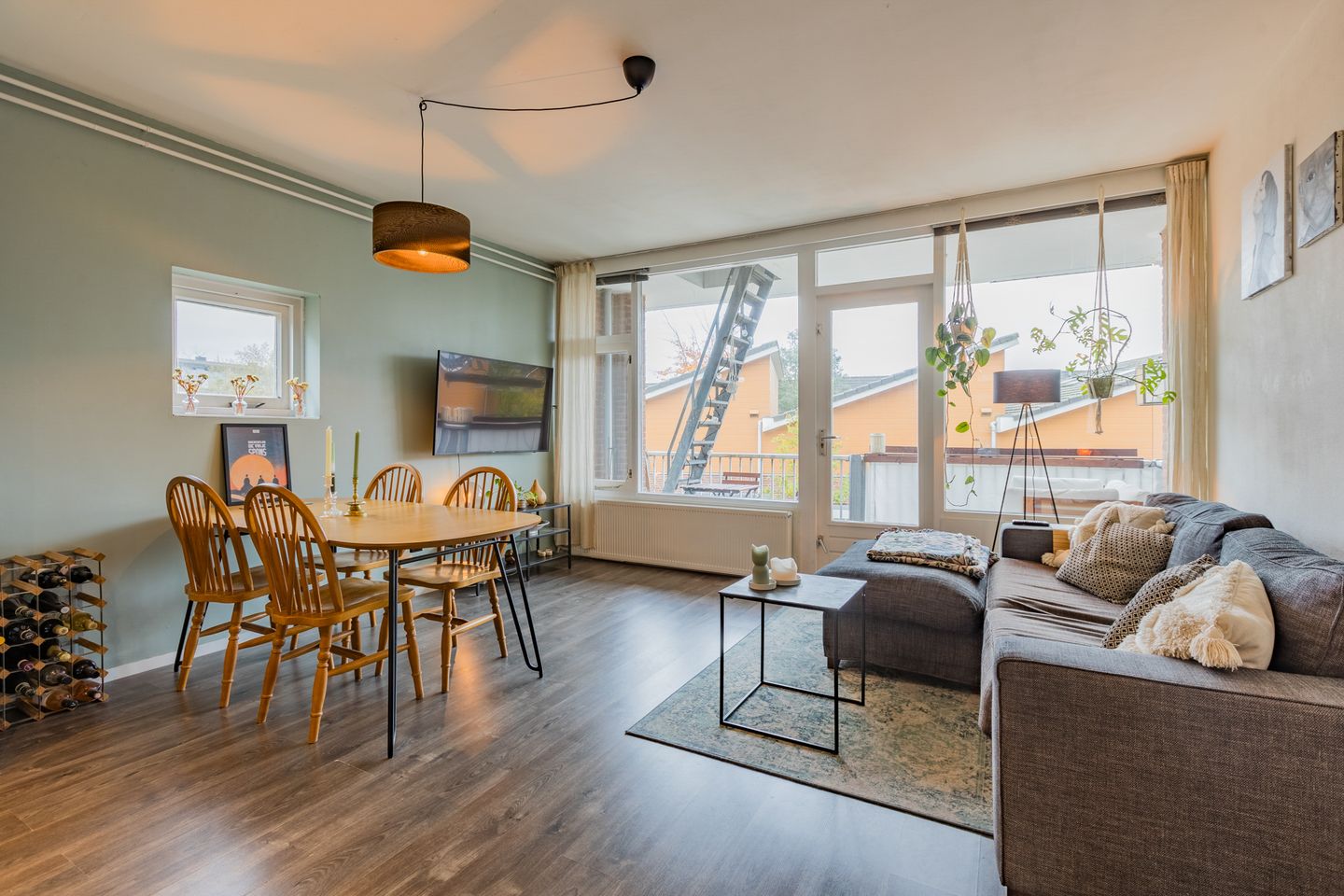 De royale woonkamer met half open keuken is voorzien van laminaatvloer.