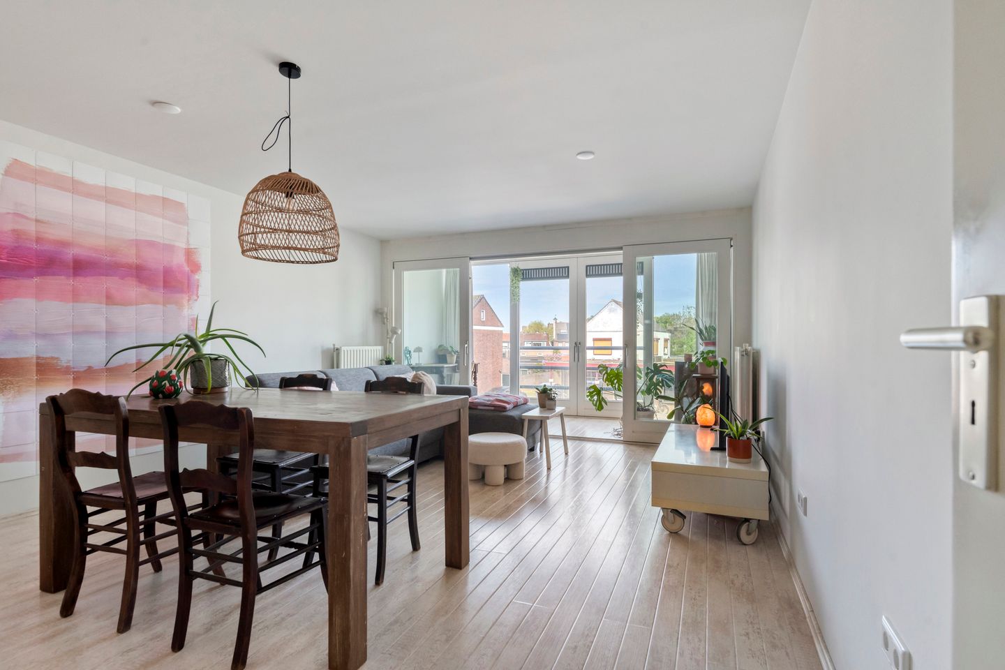 De woonkamer is licht en prettig dankzij de grote glazen pui aan de achterzijde. Hierin bevindt zich ook de open keuken, waardoor wonen, koken en leven mooi samenkomen in één ruimte. Vanuit de woonkamer heb je via een schuifdeur toegang tot de loggia, een fijne en beschutte buitenruimte die het hele jaar door het buitenleven bij je interieur betrekt.