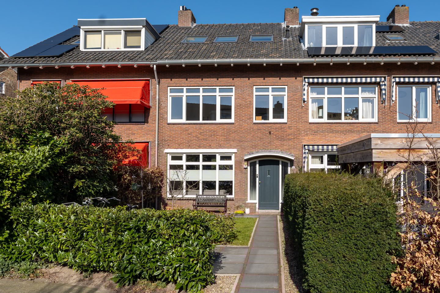 De ruime voortuin is eveneens voorzien van bestrating en een gazon.