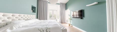 De tweede slaapkamer aan de voorzijde beschikt over een balkon. De openslaande deuren en de grote raampartijen zorgen voor veel natuurlijk lichtinval. De en suite deuren en de fraaie houten omlijsting daarvan maken deze ruimte een sfeervolle slaapkamer of en suite kleedkamer bij de master bedroom.