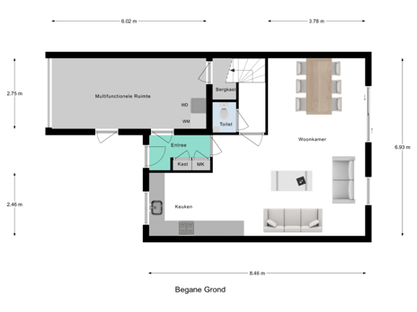 Binnenkomst in de hal met meterkast en toegang tot de woonkamer en de multifunctionele ruimte.