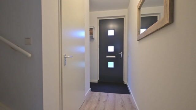 Entree in ruime hal met garderobenis geeft toegang tot het toilet, de meterkast (7 groepen, kookgroep en 2 aardlekschakelaars), een vaste trap naar de eerste verdieping en de woonkamer.
