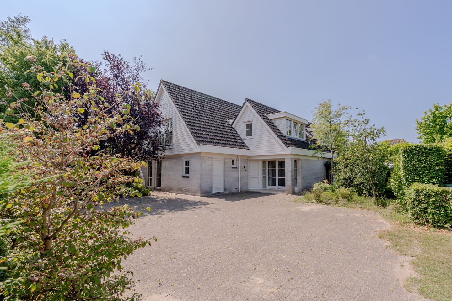 Volgroeide, privacy volle tuin rondom de woning met sierbestrating, houten terrassen en borders vol groen.