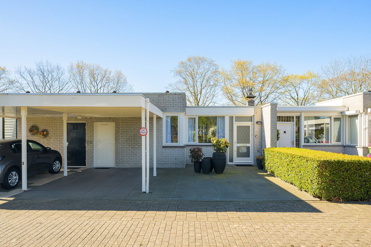 De geheel betegelde voortuin beschikt over een carport en biedt toegang tot de bijkeuken en de hal/entree.