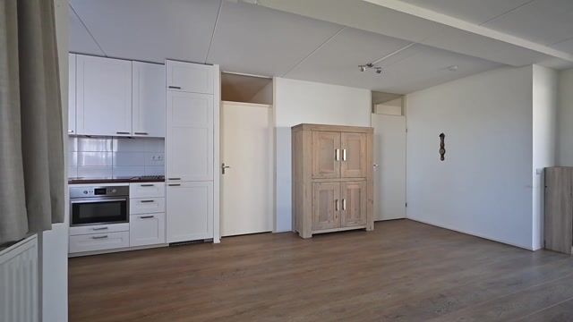 De L-vormige open keuken is praktisch ingericht en voorzien van een eikenhouten werkblad met boven- en onderkasten. De keuken beschikt verder over een RVS spoelbak, koelkast/vriezer, een 4-pits inductiekookplaat, combimagnetron, afzuigschouw en een half formaat vaatwasser. De open opstelling zorgt voor een functionele verbinding met de woonkamer.