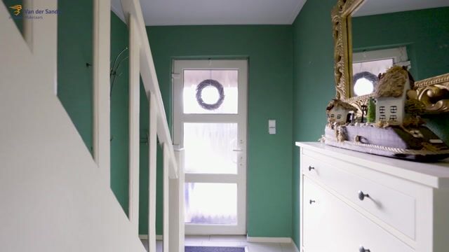 Entree / hal, met (open) trapopgang, trapkast, (met de meterkast (14 groepen, 3 aardlekschakelaars, krachtstroom, digitale dag- & nachtstroom tariefmeter, digitale gasmeter en de verdeler voor de vloerverwarming), het toilet en toegang tot de woonkamer.