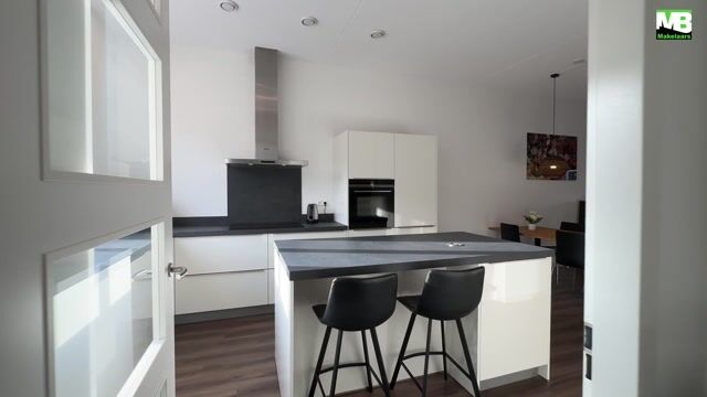 De open keuken (ca. 3.70 x 3.63m) in een hoek- en een eilandopstelling met barfunctie beschikt over veel onder- en bovenkastruimte en diverse inbouwapparatuur waaronder een inductiekookplaat, rvs afzuigkap, combi oven/magnetron, koelkast, vrieskast (3 laden), vaatwasser en een rechte spoelbak. De keuken is afgewerkt met een nette pvc vloer, een strakke stucwerk wandafwerking en voorzien van vloerverwarming, diverse inbouwspots en regelbare mechanische ventilatie.