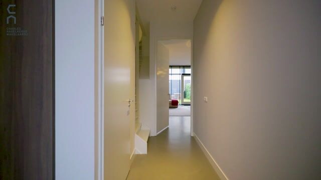De ruime entree/hal is afgewerkt met een stijlvolle gietvloer en voorzien van een maatwerk kastenwand met daarin de groepenkast en de unit voor stadsverwarming en extra opbergmogelijkheden, twee schoenenplanken en een kledingrek.