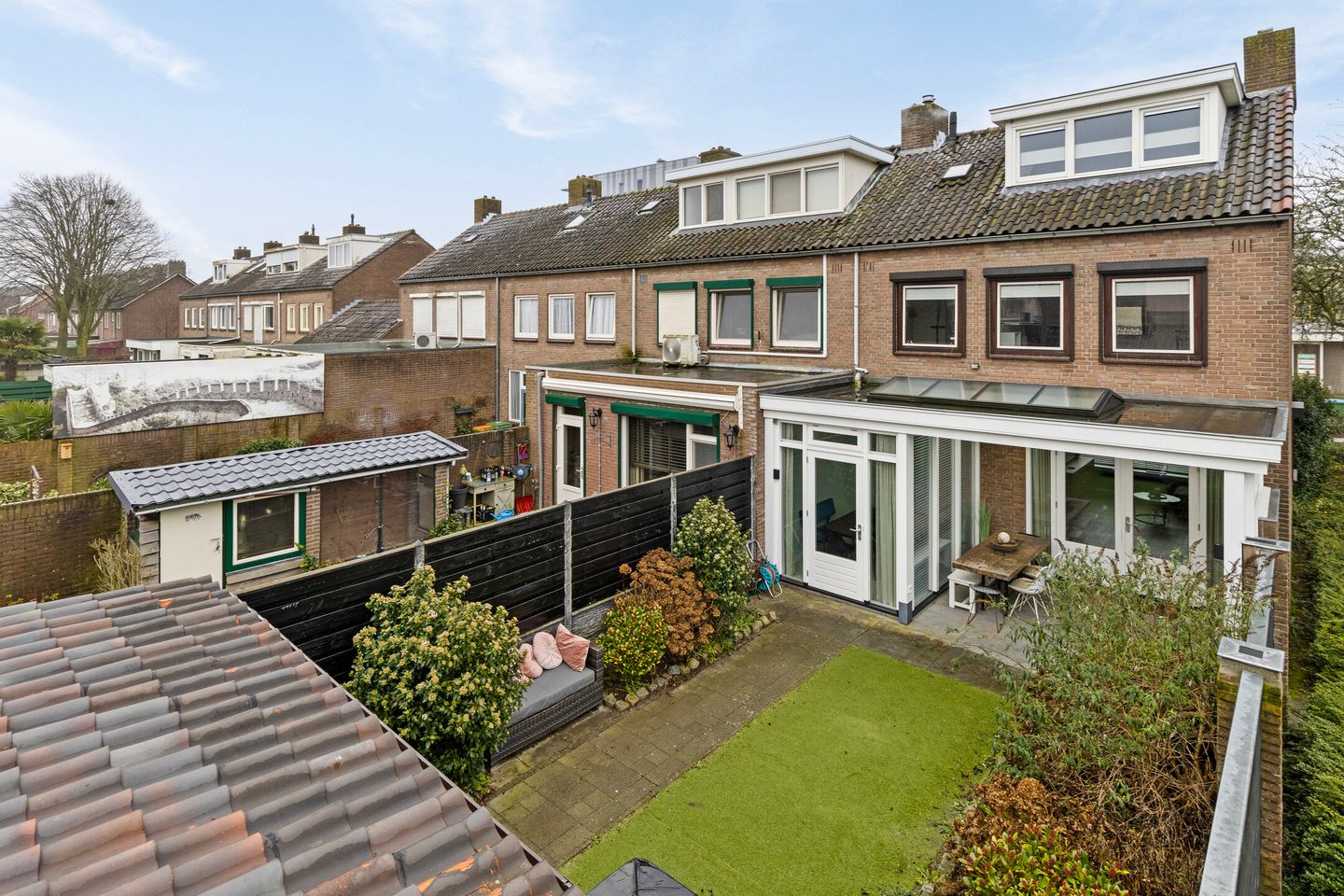 De achtertuin is voorzien van beplanting, bestrating, een kunstgazon, een tapkraan, een overkapping en een zij-ingang. Aan de woning is een sfeervolle veranda.