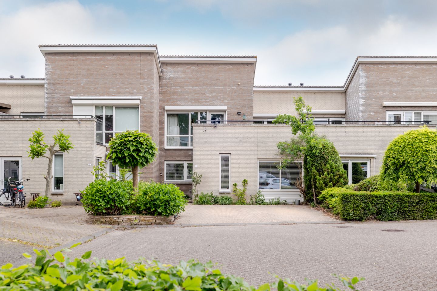 Middels bestraat aangelegde voortuin toegang tot de zij-ingang van de woning.