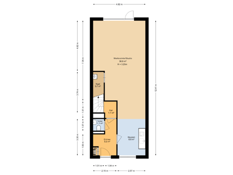 Ontvangsthal met toegang tot de leefruimte, toiletruimte en trapopgang naar de eerste verdieping.