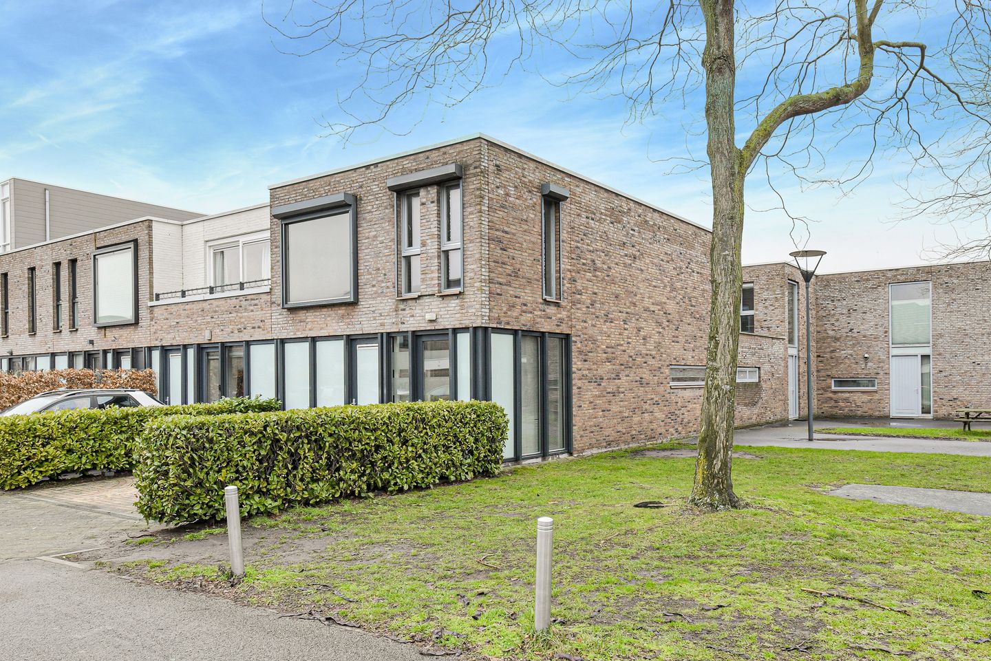 De voortuin is eveneens verzorgd aangelegd en beschikt over een eigen parkeerplaats op eigen terrein.