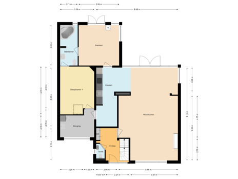 De keuken grenst direct aan zowel de woonkamer als de bijkeuken en vormt daarmee een praktisch middelpunt van de woning. De inrichting is eenvoudig maar functioneel, met volop werk- en kastruimte om dagelijks comfortabel te koken. Vanuit de keuken loop je gemakkelijk door naar de bijkeuken (de voormalige garage), waar aansluitingen voor wasmachine en droger aanwezig zijn en extra bergruimte voorhanden is. Hier vind je bovendien toegang tot de slaapkamer op de begane grond, die direct grenst aan een complete badkamer met ligbad, toilet en wastafelmeubel. Dit maakt de begane grond niet alleen verrassend veelzijdig, maar ook geschikt voor levensloopbestendig wonen of een kantoor/praktijk aan huis.