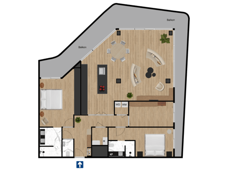 Het unieke balkon loopt rondom het appartement en is direct toegankelijk vanuit de woonkamer, keuken én alle slaapkamers. Geniet van het altijd veranderende uitzicht op de voorbijvarende schepen, de indrukwekkende zonsondergangen en de rustgevende omgeving van het water.