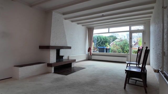 Via de entree zijn 2 kamers bereikbaar en via een schuifdeur de 3e kamer. Deze ruimte is in gebruik geweest als kantoor, maar kan ook gebruikt worden als aparte slaapkamers. Via de achterliggende hal met deur naar de tuin, welke toegang verleent aan het toilet met fonteintje en berging, zijn de woonkamer en open keuken bereikbaar. De woonkamer is voorzien van 2 lichtkoepels, een open haard en heeft eveneens een deur naar de tuin.